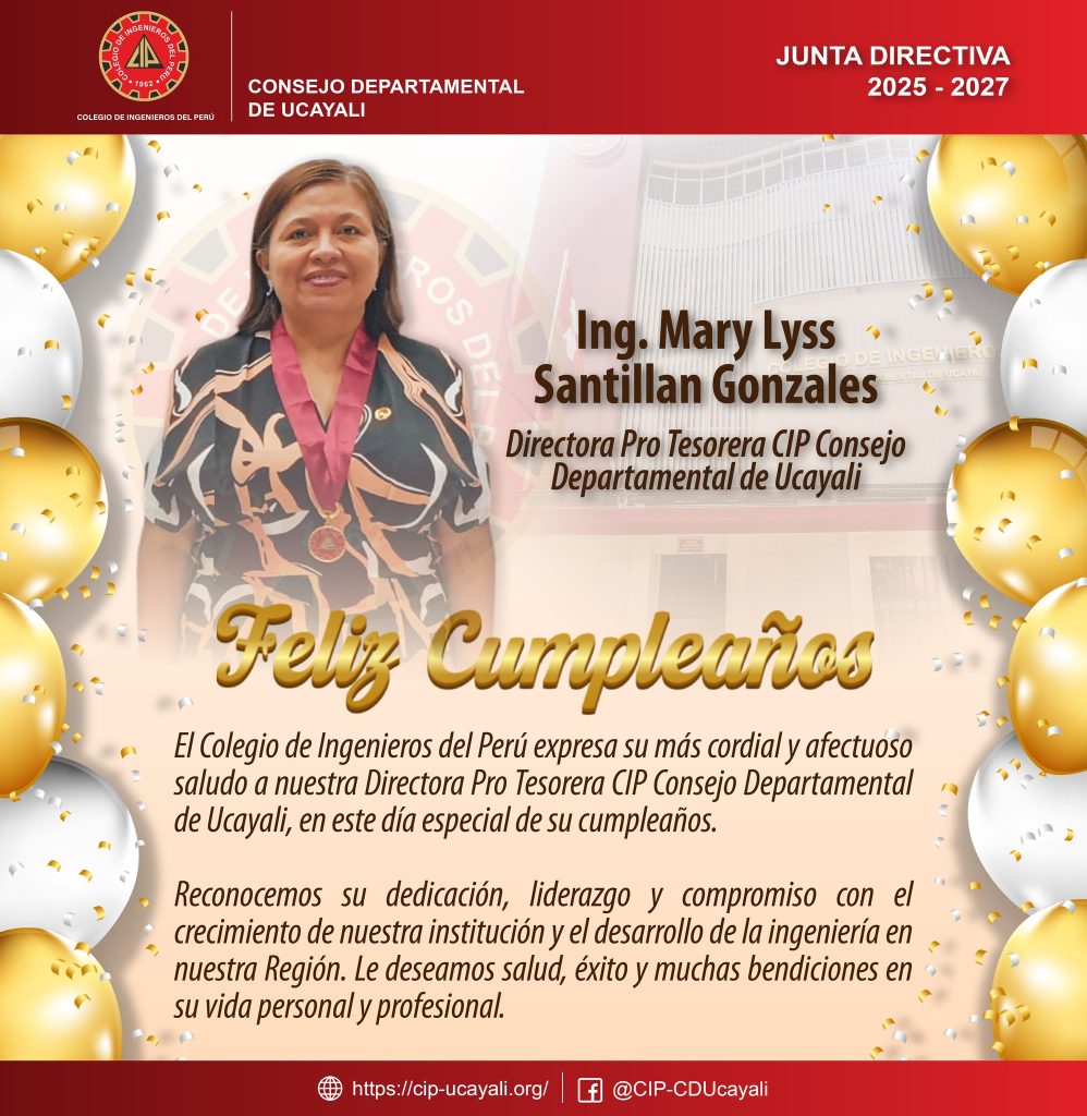 El Colegio de Ingenieros del Perú expresa su más cordial y afectuoso saludo a la 𝗜𝗻𝗴. 𝗠𝗮𝗿𝘆 𝗟𝘆𝘀𝘀 𝗦𝗮𝗻𝘁𝗶𝗹𝗹𝗮𝗻 𝗚𝗼𝗻𝘇𝗮𝗹𝗲𝘀, en este día especial de su cumpleaños. ![]()