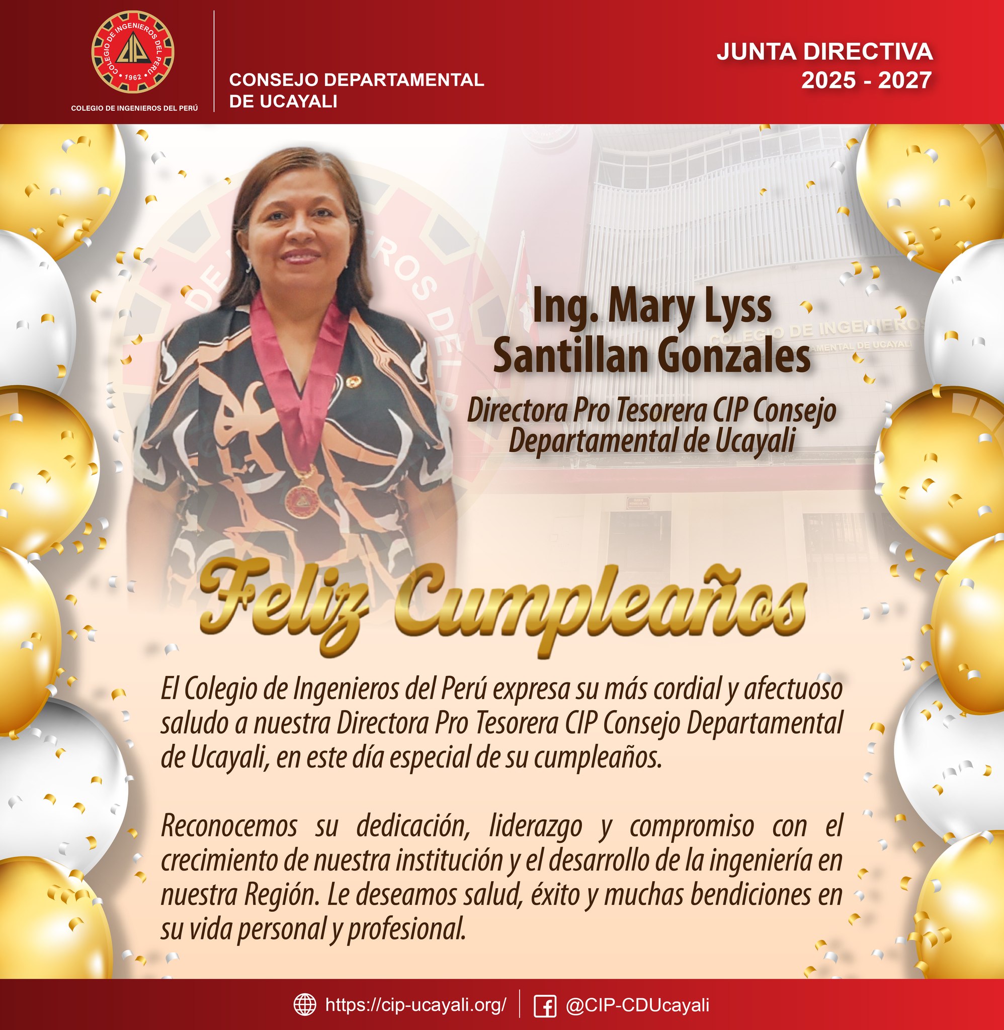 El Colegio de Ingenieros del Perú expresa su más cordial y afectuoso saludo a la 𝗜𝗻𝗴. 𝗠𝗮𝗿𝘆 𝗟𝘆𝘀𝘀 𝗦𝗮𝗻𝘁𝗶𝗹𝗹𝗮𝗻 𝗚𝗼𝗻𝘇𝗮𝗹𝗲𝘀, en este día especial de su cumpleaños. Reconocemos su dedicación, liderazgo y compromiso con el crecimiento de nuestra institución y el desarrollo de la ingeniería en el país. Le deseamos salud, éxito y muchas bendiciones en su vida personal y profesional. ¡Feliz cumpleaños!