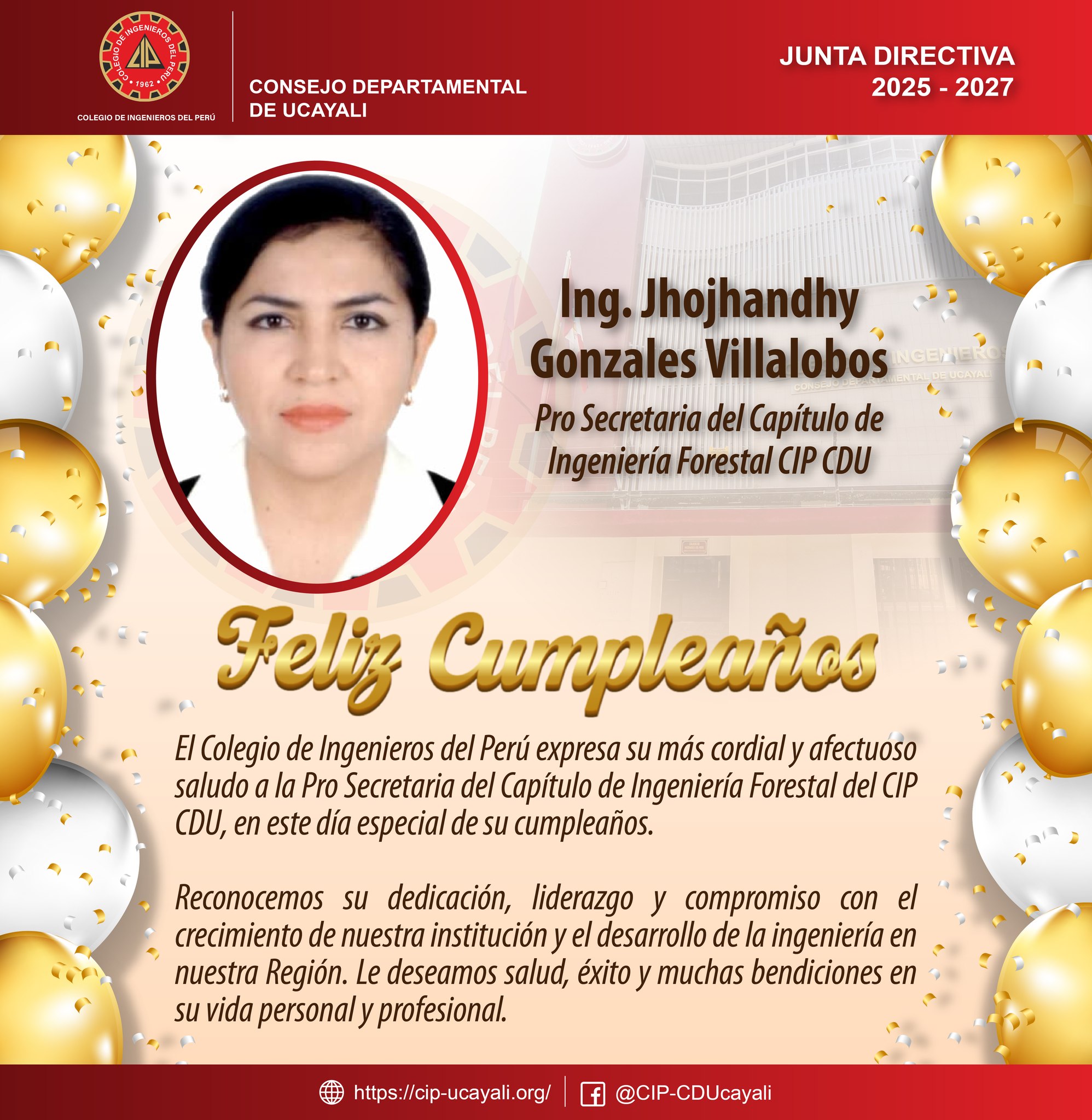 El Colegio de Ingenieros del Perú expresa su más cordial y afectuoso saludo a la 𝗜𝗻𝗴. 𝗝𝗵𝗼𝗷𝗵𝗮𝗻𝗱𝗵𝘆 𝗚𝗼𝗻𝘇𝗮𝗹𝗲𝘀 𝗩𝗶𝗹𝗹𝗮𝗹𝗼𝗯𝗼𝘀, Pro Secretaria del Capítulo de Ingeniería Forestal CIP CDU, en este día especial de su cumpleaños. Reconocemos su dedicación, liderazgo y compromiso con el crecimiento de nuestra institución y el desarrollo de la ingeniería en el país. Le deseamos salud, éxito y muchas bendiciones en su vida personal y profesional. ¡Feliz cumpleaños!
