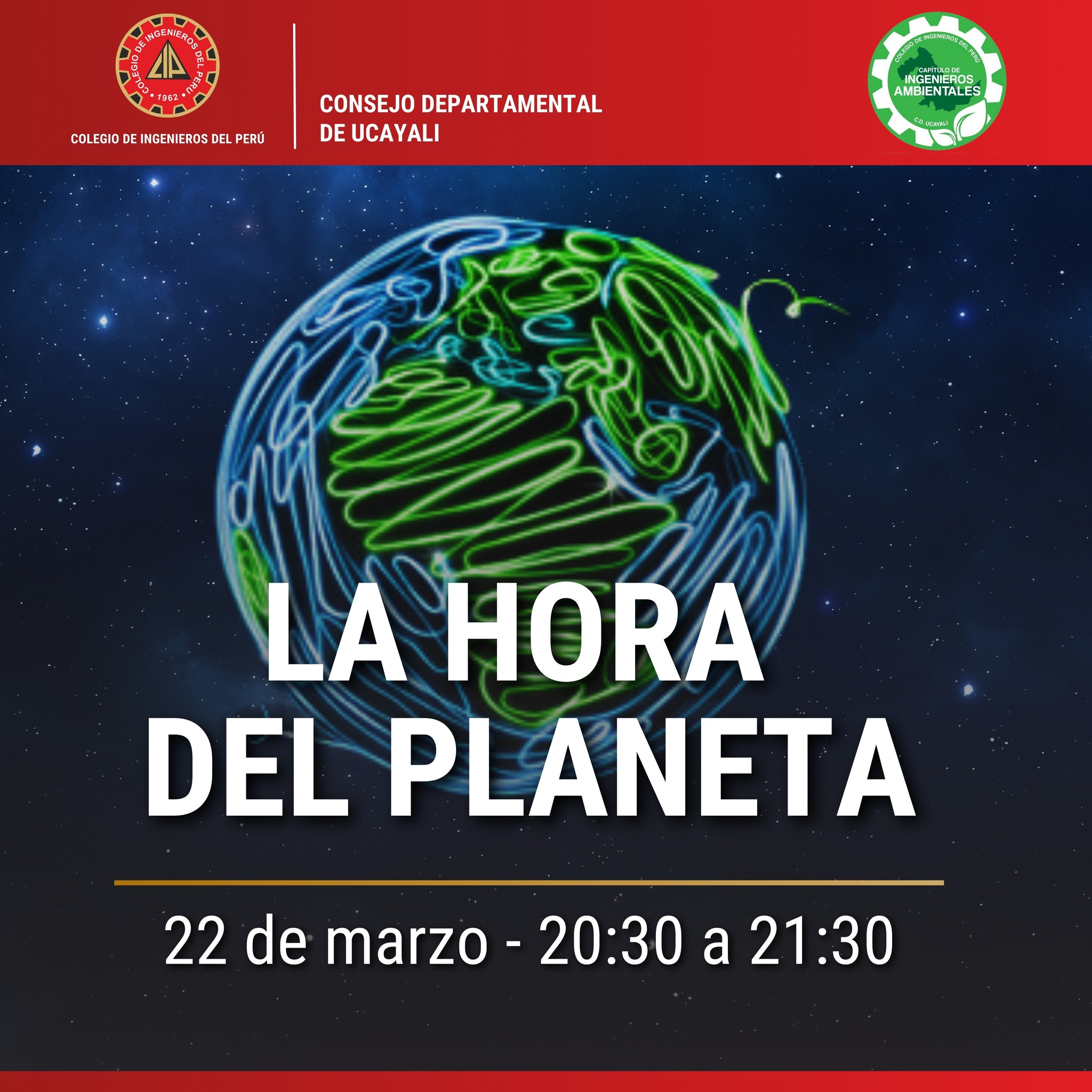Este sábado 22 de marzo de 20:30 a 21:30, apaguemos las luces y desconectemos lo innecesario para darle un respiro al planeta. La Hora del Planeta es más que un acto simbólico: es un llamado a la acción para combatir el cambio climático y proteger nuestra biodiversidad. Desde el Colegio de Ingenieros del Perú – Consejo Departamental de Ucayali, te invitamos a sumarte y demostrar que juntos podemos marcar la diferencia. Apaga las luces. Reflexiona sobre tu impacto ambiental. Comprométete con un estilo de vida más sostenible.