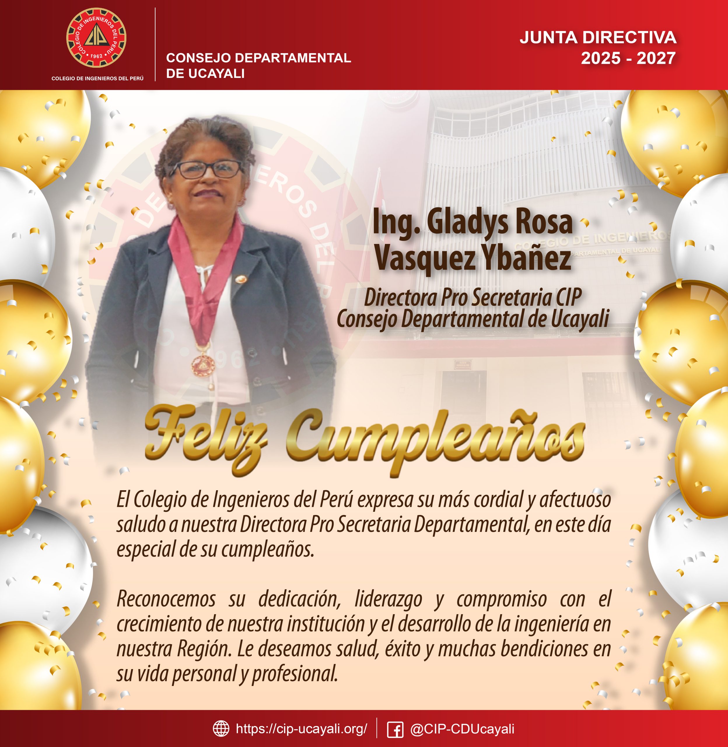 El Colegio de Ingenieros del Perú expresa su más cordial y afectuoso saludo a la 𝗜𝗻𝗴. 𝗚𝗹𝗮𝗱𝘆𝘀 𝗥𝗼𝘀𝗮 𝗩𝗮𝘀𝗾𝘂𝗲𝘇 𝗬𝗯𝗮𝗻̃𝗲𝘇, Directora Pro Secretaria CIP Departamental de Ucayali, en este día especial de su cumpleaños. Reconocemos su dedicación, liderazgo y compromiso con el crecimiento de nuestra institución y el desarrollo de la ingeniería en el país. Le deseamos salud, éxito y muchas bendiciones en su vida personal y profesional. ¡Feliz cumpleaños!