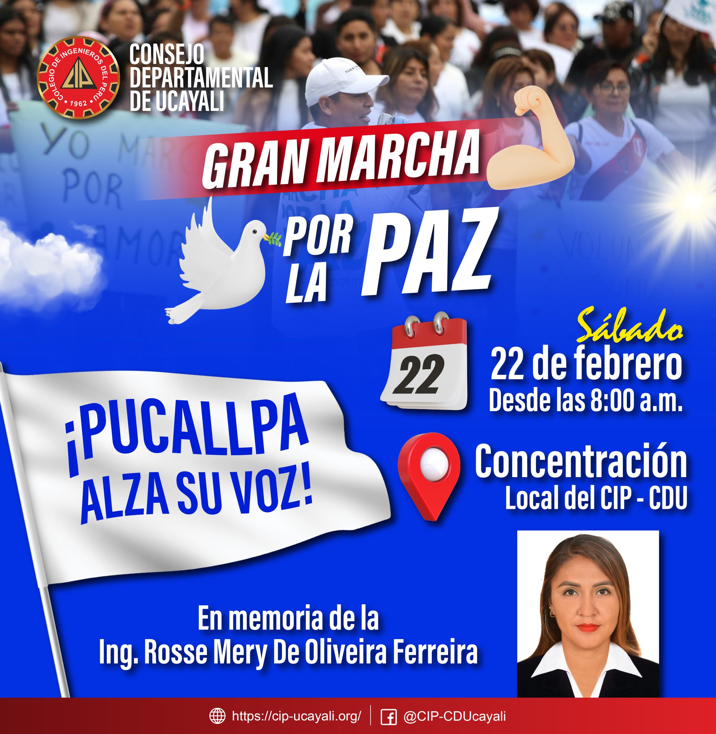 El Colegio de Ingenieros del Perú – Consejo Departamental Ucayali convoca a todos los ciudadanos a una Gran Marcha por la Paz, uniendo fuerzas para exigir más seguridad y combatir la delincuencia en nuestra región.📍 𝗣𝘂𝗻𝘁𝗼 𝗱𝗲 𝗲𝗻𝗰𝘂𝗲𝗻𝘁𝗿𝗼: Local del CIP CDU📅 𝗙𝗲𝗰𝗵𝗮: Sábado 22 de febrero 2025⏰ 𝗛𝗼𝗿𝗮: 8:00 a.m.Juntos podemos hacer la diferencia. Salgamos a las calles para exigir un Ucayali más seguro y libre de violencia. ¡Tu voz y tu presencia cuentan!