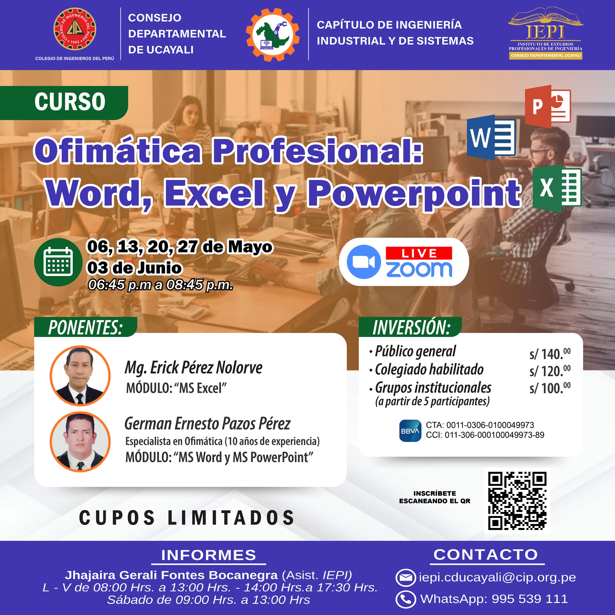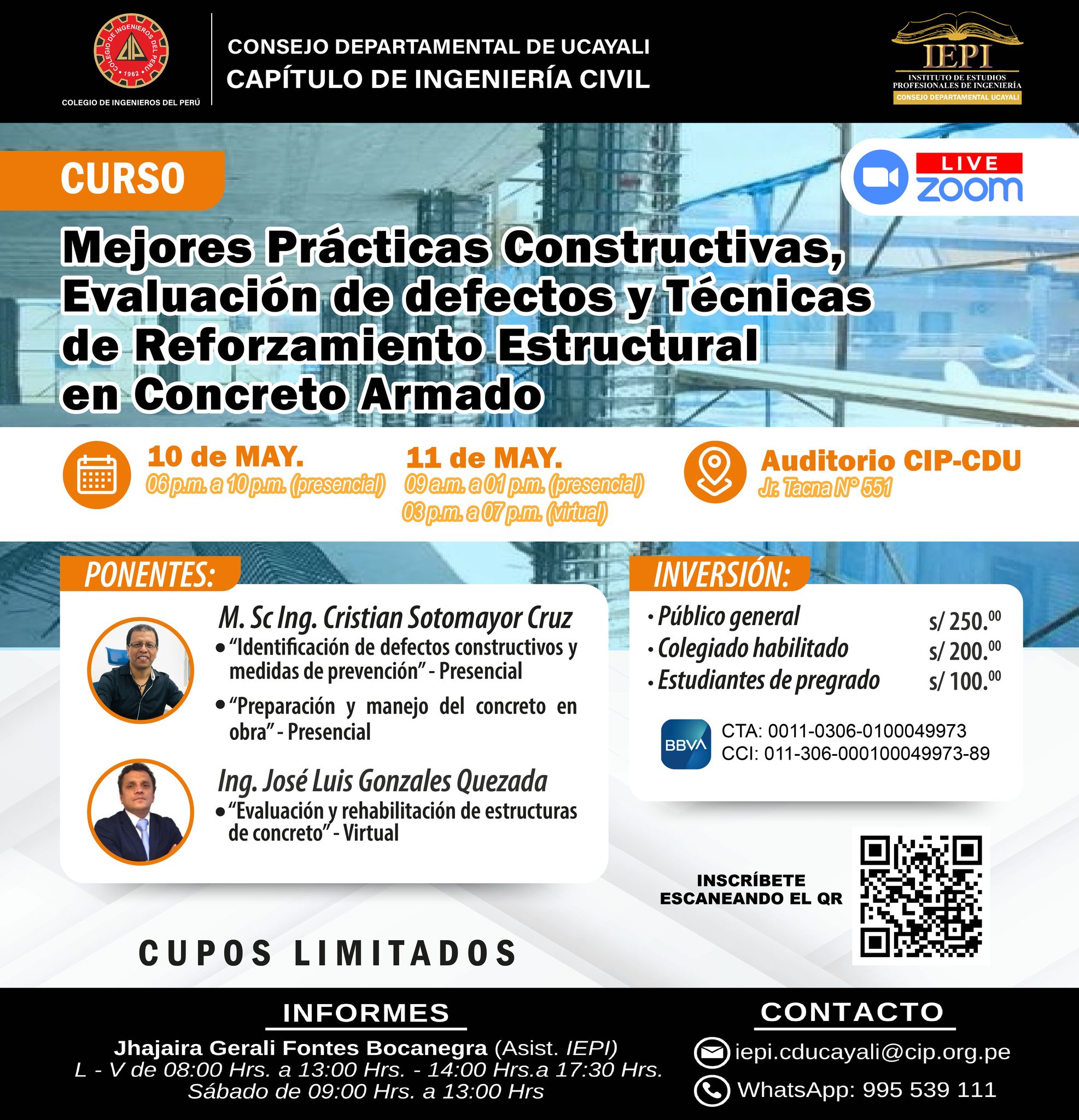 𝗙𝗲𝗰𝗵𝗮: 10 y 11 de Mayo 𝗛𝗼𝗿𝗮: 06:00 p.m. a 10:00 p.m. 𝗜𝗻𝘀𝗰𝗿𝗶𝗽𝗰𝗶𝗼́𝗻: https://forms.gle/urj4u8aPNdNRagM2A 𝗣𝗼𝗻𝗲𝗻𝘁𝗲: M. Sc Ing. Cristian Sotomayor Cruz y Ing. José Luis Gonzales Quezada 𝗜𝗻𝘃𝗲𝗿𝘀𝗶𝗼́𝗻:Público general: S/. 250.00Colegiado habilitado S/. 200.00Estudiantes de pregrado S/. 100.00 𝗗𝗘𝗣𝗢́𝗦𝗜𝗧𝗢 𝗘𝗡 𝗕𝗕𝗩𝗔:CTA: 0011-0306-0100049973CCI: 011-306-000100049973-89 𝗜𝗡𝗙𝗢𝗥𝗠𝗘𝗦:(Asis. IEPI/CIP-CDU) – 995 539 111Link directo a WhatsApp: https://wa.me/51995539111Correo: iepi.cducayali@cip.org.pe 𝗛𝗢𝗥𝗔𝗥𝗜𝗢 𝗗𝗘 𝗔𝗧𝗘𝗡𝗖𝗜𝗢́𝗡 𝗜𝗘𝗣𝗜/𝗖𝗜𝗣-𝗖𝗗𝗨:L – V de 08:00 Hrs. a 13:00 Hrs. – 14:00 Hrs. a 17:30 Hrs.Sábado de 09:00 Hrs. a 13:00 Hrs