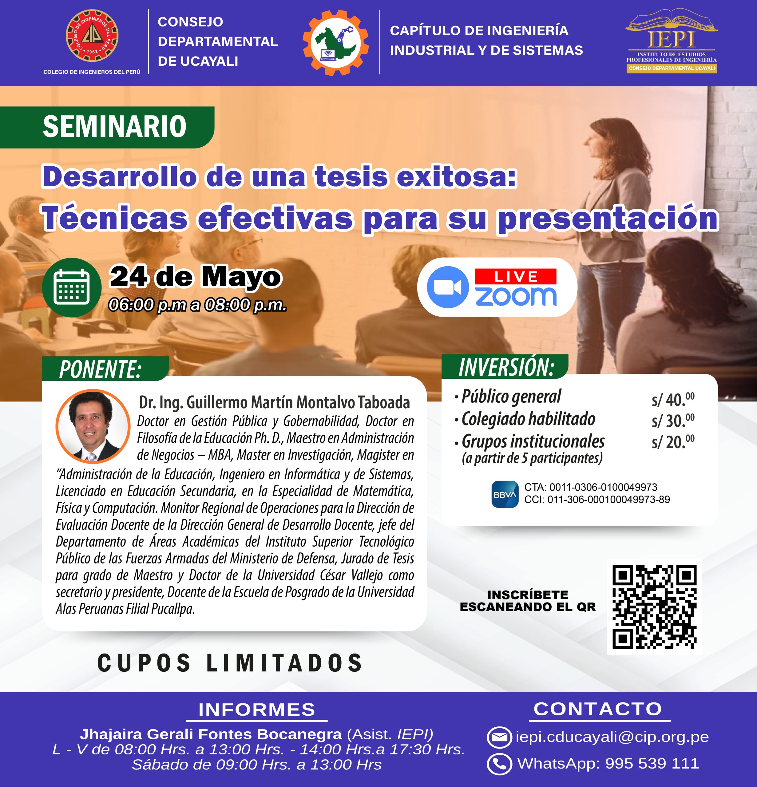 𝗙𝗲𝗰𝗵𝗮: 24 de Mayo 𝗛𝗼𝗿𝗮: 06:00 p.m. a 08:00 p.m. 𝗜𝗻𝘀𝗰𝗿𝗶𝗽𝗰𝗶𝗼́𝗻: https://forms.gle/SUhnuDG2PKKeggvz7 𝗣𝗼𝗻𝗲𝗻𝘁𝗲: Dr. Ing. Guillermo Martín Montalvo Taboada 𝗜𝗻𝘃𝗲𝗿𝘀𝗶𝗼́𝗻:Público general: S/. 40.00Colegiado habilitado S/. 30.00Grupos institucionales S/. 20.00 (a partir de 5 participantes) 📁 𝗕𝗥𝗢𝗖𝗛𝗨𝗥𝗘: Descargar aqui 𝗗𝗘𝗣𝗢́𝗦𝗜𝗧𝗢 𝗘𝗡 𝗕𝗕𝗩𝗔:CTA: 0011-0306-0100049973CCI: 011-306-000100049973-89 𝗜𝗠𝗣𝗢𝗥𝗧𝗔𝗡𝗧𝗘: 𝑒𝑛𝑣𝑖𝑎𝑟 𝑣𝑎́𝑢𝑐ℎ𝑒𝑟 𝗜𝗡𝗙𝗢𝗥𝗠𝗘𝗦:NRO CIP-CDU: 995 301 199Link directo a WhatsApp: https://wa.me/51995301199 𝗛𝗢𝗥𝗔𝗥𝗜𝗢 𝗗𝗘 𝗔𝗧𝗘𝗡𝗖𝗜𝗢́𝗡 𝗖𝗜𝗣-𝗖𝗗𝗨:L – V de 08:00 Hrs. a 13:00 Hrs. – 14:00 Hrs.a 18:30 Hrs.Sábado de 09:00 Hrs. a 13:00 Hrs