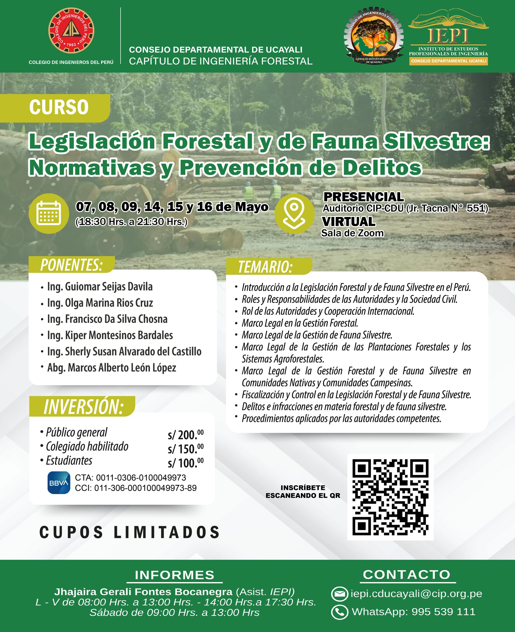 𝗙𝗲𝗰𝗵𝗮: 07, 08, 09, 14, 15 y 16 de Mayo 𝗛𝗼𝗿𝗮: 06:30 p.m. a 09:30 p.m. 𝗜𝗻𝘀𝗰𝗿𝗶𝗽𝗰𝗶𝗼́𝗻: https://forms.gle/48gxnWweGWoC83z69 𝗜𝗻𝘃𝗲𝗿𝘀𝗶𝗼́𝗻:Público general: S/. 200.00Colegiado habilitado S/. 150.00Estudiantes S/. 100.00 𝗗𝗘𝗣𝗢́𝗦𝗜𝗧𝗢 𝗘𝗡 𝗕𝗕𝗩𝗔:CTA: 0011-0306-0100049973CCI: 011-306-000100049973-89 𝗜𝗡𝗙𝗢𝗥𝗠𝗘𝗦:(Asis. IEPI/CIP-CDU) – 995 539 111Link directo a WhatsApp: https://wa.me/51995539111Correo: iepi.cducayali@cip.org.pe 𝗛𝗢𝗥𝗔𝗥𝗜𝗢 𝗗𝗘 𝗔𝗧𝗘𝗡𝗖𝗜𝗢́𝗡 𝗜𝗘𝗣𝗜/𝗖𝗜𝗣-𝗖𝗗𝗨:L – V de 08:00 Hrs. a 13:00 Hrs. – 14:00 Hrs. a 17:30 Hrs.Sábado de 09:00 Hrs. a 13:00 Hrs