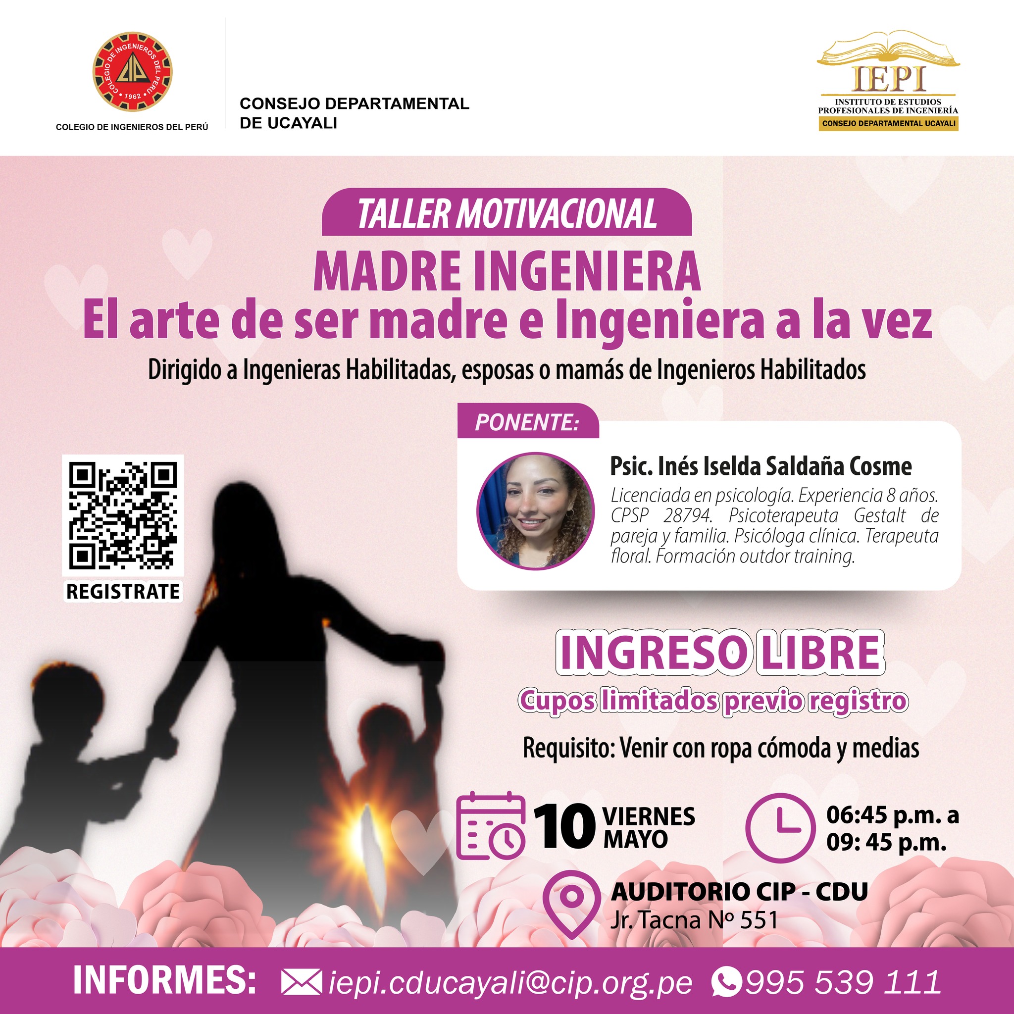 𝗙𝗲𝗰𝗵𝗮: 10 de Mayo del 2024 (7:00 pm) 𝗜𝗻𝘀𝗰𝗿𝗶𝗽𝗰𝗶𝗼́𝗻: https://forms.gle/o7itumyaKWgLocX89 Asistir con ropa cómoda y medias para las dinámicas 𝗜𝗡𝗙𝗢𝗥𝗠𝗘𝗦:(Asis. IEPI/CIP-CDU) – 995 539 111Link directo a WhatsApp: https://wa.me/51995539111Correo: iepi.cducayali@cip.org.pe 𝗛𝗢𝗥𝗔𝗥𝗜𝗢 𝗗𝗘 𝗔𝗧𝗘𝗡𝗖𝗜𝗢́𝗡 𝗜𝗘𝗣𝗜/𝗖𝗜𝗣-𝗖𝗗𝗨:L – V de 08:00 Hrs. a 13:00 Hrs. – 14:00 Hrs. a 17:30 Hrs.Sábado de 09:00 Hrs. a 13:00 Hrs