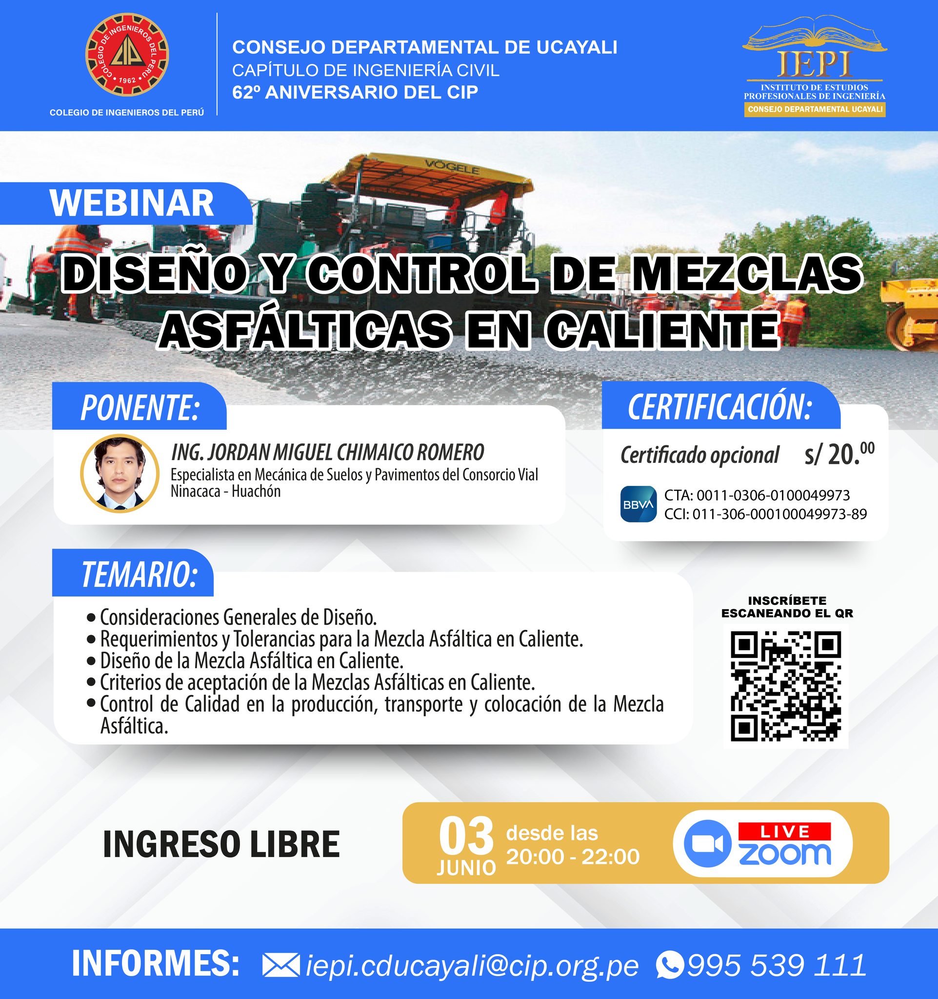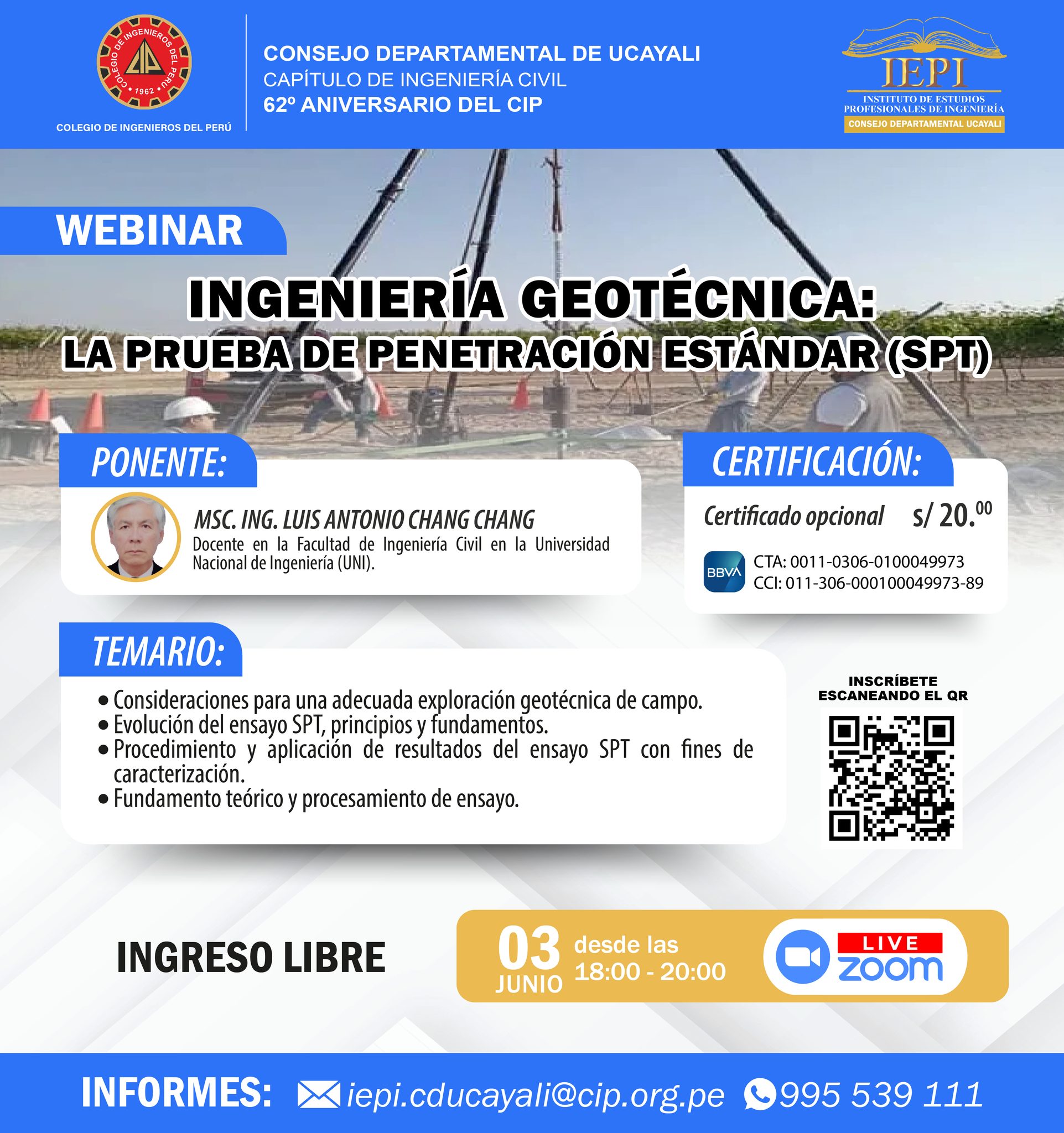 𝐒𝐄𝐌𝐀𝐍𝐀 𝐃𝐄 𝐀𝐍𝐈𝐕𝐄𝐑𝐒𝐀𝐑𝐈𝐎 𝐃𝐄 𝐋𝐀 𝐈𝐍𝐆𝐄𝐍𝐈𝐄𝐑𝐈́𝐀 𝗙𝗲𝗰𝗵𝗮: 03 de Junio (Virtual) 𝗛𝗼𝗿𝗮: 18:00 Hrs. – 20:00 Hrs. 𝗕𝗿𝗼𝗰𝗵𝘂𝗿𝗲: https://drive.google.com/…/1fMRgmaCupP5GFvCQLFz…/view… 𝗜𝗻𝘀𝗰𝗿𝗶𝗽𝗰𝗶𝗼́𝗻: https://forms.gle/M98ayuduxiYHkDNg6 𝗣𝗼𝗻𝗲𝗻𝘁𝗲: Msc. Ing. Civil Luis Antonio Chang Chang 𝗖𝗲𝗿𝘁𝗶𝗳𝗶𝗰𝗮𝗱𝗼: Opcional S/.20.00 𝗜𝗡𝗙𝗢𝗥𝗠𝗘𝗦:(Asis. IEPI/CIP-CDU) – 995 539 111Link directo a WhatsApp: https://wa.me/51995539111Correo: iepi.cducayali@cip.org.pe 𝗛𝗢𝗥𝗔𝗥𝗜𝗢 𝗗𝗘 𝗔𝗧𝗘𝗡𝗖𝗜𝗢́𝗡 𝗜𝗘𝗣𝗜/𝗖𝗜𝗣-𝗖𝗗𝗨:L – V de 08:00 Hrs. a 13:00 Hrs. – 14:00 Hrs. a 17:30 Hrs.Sábado de 09:00 Hrs. a 13:00 Hrs