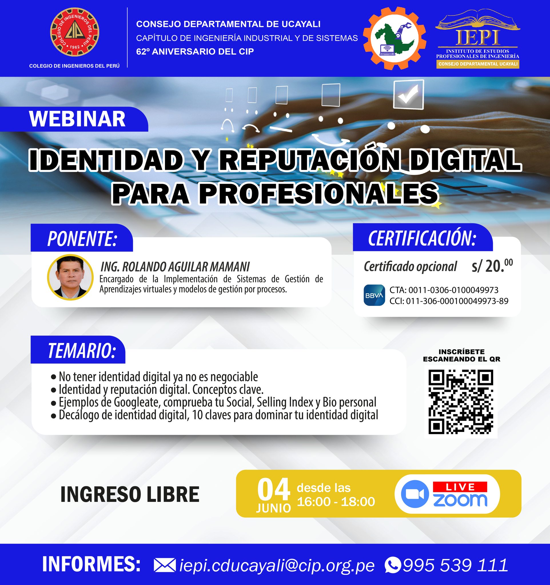 𝐒𝐄𝐌𝐀𝐍𝐀 𝐃𝐄 𝐀𝐍𝐈𝐕𝐄𝐑𝐒𝐀𝐑𝐈𝐎 𝐃𝐄 𝐋𝐀 𝐈𝐍𝐆𝐄𝐍𝐈𝐄𝐑𝐈́𝐀 𝗙𝗲𝗰𝗵𝗮: 04 de Junio (Virtual) 𝗛𝗼𝗿𝗮: 16:00 Hrs. – 18:00 Hrs. 𝗕𝗿𝗼𝗰𝗵𝘂𝗿𝗲: https://drive.google.com/…/1dsvQq1eVUVDDnHOHbcW…/view… 𝗜𝗻𝘀𝗰𝗿𝗶𝗽𝗰𝗶𝗼́𝗻: https://forms.gle/M98ayuduxiYHkDNg6 𝗣𝗼𝗻𝗲𝗻𝘁𝗲: Ing. Rolando Aguilar Mamani 𝗖𝗲𝗿𝘁𝗶𝗳𝗶𝗰𝗮𝗱𝗼: Opcional S/.20.00 𝗜𝗡𝗙𝗢𝗥𝗠𝗘𝗦:(Asis. IEPI/CIP-CDU) – 995 539 111Link directo a WhatsApp: https://wa.me/51995539111Correo: iepi.cducayali@cip.org.pe 𝗛𝗢𝗥𝗔𝗥𝗜𝗢 𝗗𝗘 𝗔𝗧𝗘𝗡𝗖𝗜𝗢́𝗡 𝗜𝗘𝗣𝗜/𝗖𝗜𝗣-𝗖𝗗𝗨:L – V de 08:00 Hrs. a 13:00 Hrs. – 14:00 Hrs. a 17:30 Hrs.Sábado de 09:00 Hrs. a 13:00 Hrs