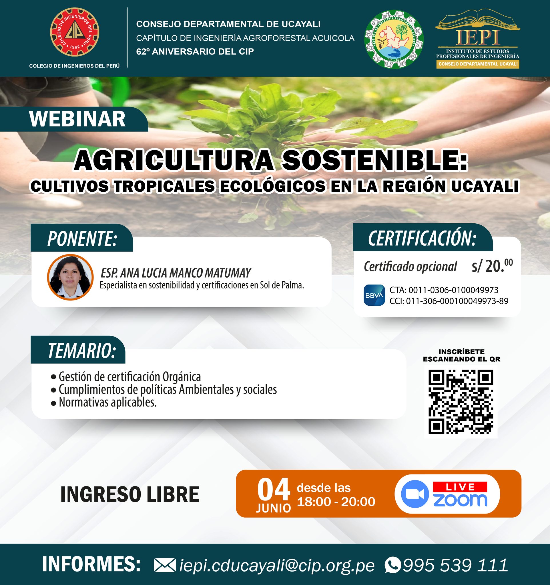 𝐒𝐄𝐌𝐀𝐍𝐀 𝐃𝐄 𝐀𝐍𝐈𝐕𝐄𝐑𝐒𝐀𝐑𝐈𝐎 𝐃𝐄 𝐋𝐀 𝐈𝐍𝐆𝐄𝐍𝐈𝐄𝐑𝐈́𝐀 𝗙𝗲𝗰𝗵𝗮: 04 de Junio (Virtual) 𝗛𝗼𝗿𝗮: 18:00 Hrs. – 20:00 Hrs. 𝗕𝗿𝗼𝗰𝗵𝘂𝗿𝗲: https://drive.google.com/…/1T9WgEceaDMVc…/view… 𝗜𝗻𝘀𝗰𝗿𝗶𝗽𝗰𝗶𝗼́𝗻: https://forms.gle/M98ayuduxiYHkDNg6 𝗣𝗼𝗻𝗲𝗻𝘁𝗲: Esp. Ana Lucia Manco Matumay 𝗖𝗲𝗿𝘁𝗶𝗳𝗶𝗰𝗮𝗱𝗼: Opcional S/.20.00 𝗜𝗡𝗙𝗢𝗥𝗠𝗘𝗦:(Asis. IEPI/CIP-CDU) – 995 539 111Link directo a WhatsApp: https://wa.me/51995539111Correo: iepi.cducayali@cip.org.pe 𝗛𝗢𝗥𝗔𝗥𝗜𝗢 𝗗𝗘 𝗔𝗧𝗘𝗡𝗖𝗜𝗢́𝗡 𝗜𝗘𝗣𝗜/𝗖𝗜𝗣-𝗖𝗗𝗨:L – V de 08:00 Hrs. a 13:00 Hrs. – 14:00 Hrs. a 17:30 Hrs.Sábado de 09:00 Hrs. a 13:00 Hrs