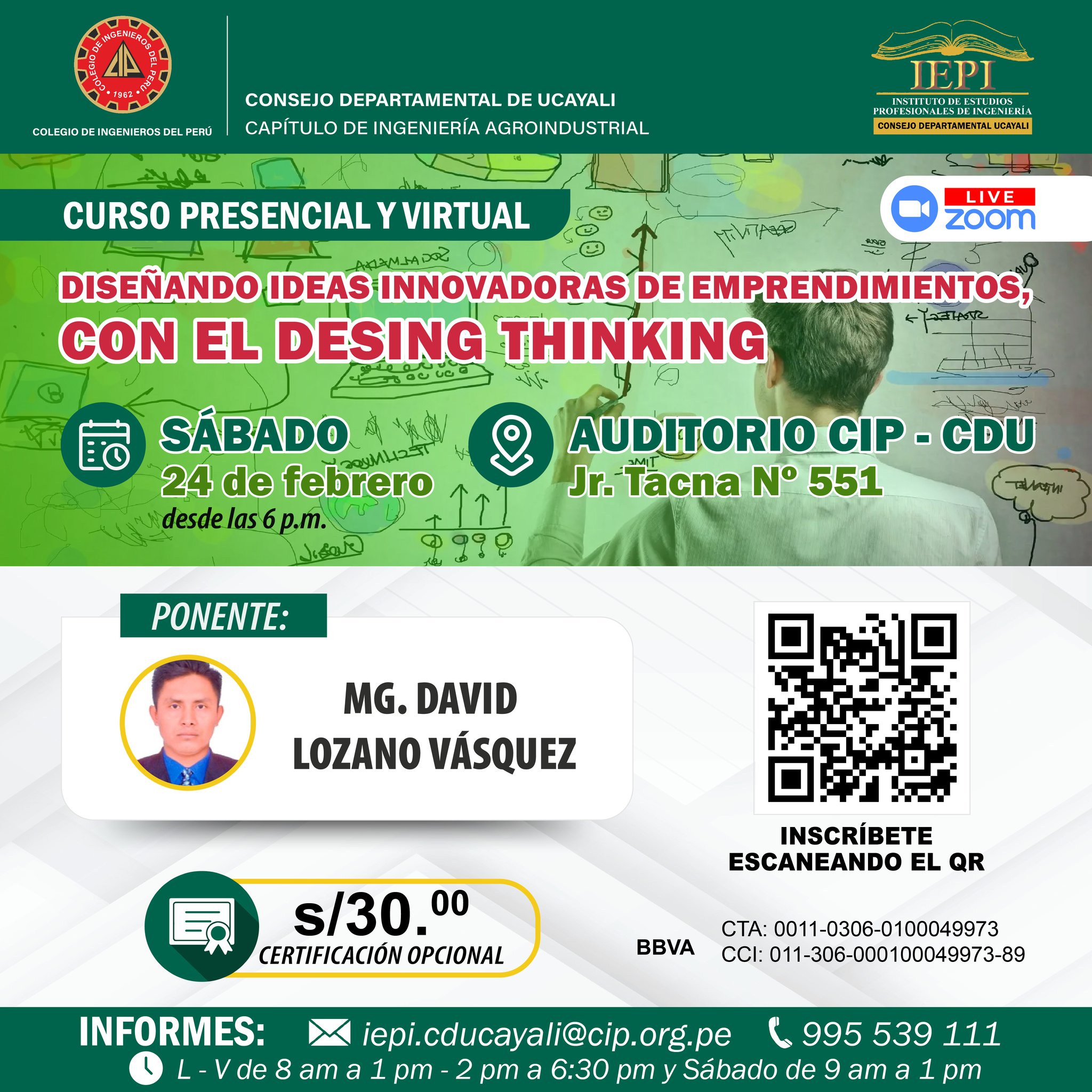 𝗙𝗲𝗰𝗵𝗮: 24 de Febrero 2024 (6:00 pm) 𝗜𝗻𝘀𝗰𝗿𝗶𝗽𝗰𝗶𝗼́𝗻: https://forms.gle/4CwU7hMGTjUUmbKm7 𝗣𝗼𝗻𝗲𝗻𝘁𝗲: Mg. David Lozano Vásquez 𝗖𝗲𝗿𝘁𝗶𝗳𝗶𝗰𝗮𝗱𝗼 𝗢𝗽𝗰𝗶𝗼𝗻𝗮𝗹: S/ 30.00 𝗗𝗘𝗣𝗢́𝗦𝗜𝗧𝗢 𝗘𝗡 𝗕𝗕𝗩𝗔:CTA: 0011-0306-0100049973CCI: 011-306-000100049973-89 𝗜𝗠𝗣𝗢𝗥𝗧𝗔𝗡𝗧𝗘: 𝑒𝑛𝑣𝑖𝑎𝑟 𝑣𝑎́𝑢𝑐ℎ𝑒𝑟 𝑎 𝑙𝑎 𝑆𝑟𝑡𝑎. 𝑎𝑠𝑖𝑠𝑡𝑒𝑛𝑡𝑒 𝑑𝑒 𝐼𝐸𝑃𝐼/𝐶𝐼𝑃-𝐶𝐷𝑈 𝗜𝗡𝗙𝗢𝗥𝗠𝗘𝗦:Jhajaira Gerali Fontes Bocanegra – 995 539 111(Asis. IEPI/CIP-CDU)Link directo a WhatsApp: https://wa.me/51995539111Correo: iepi.cducayali@cip.org.pe 𝗛𝗢𝗥𝗔𝗥𝗜𝗢 𝗗𝗘 𝗔𝗧𝗘𝗡𝗖𝗜𝗢́𝗡 𝗜𝗘𝗣𝗜/𝗖𝗜𝗣-𝗖𝗗𝗨:L – V de 08:00 Hrs. a 13:00 Hrs. – 14:00 Hrs. a 17:30 Hrs.Sábado de 09:00 Hrs. a 13:00 Hrs