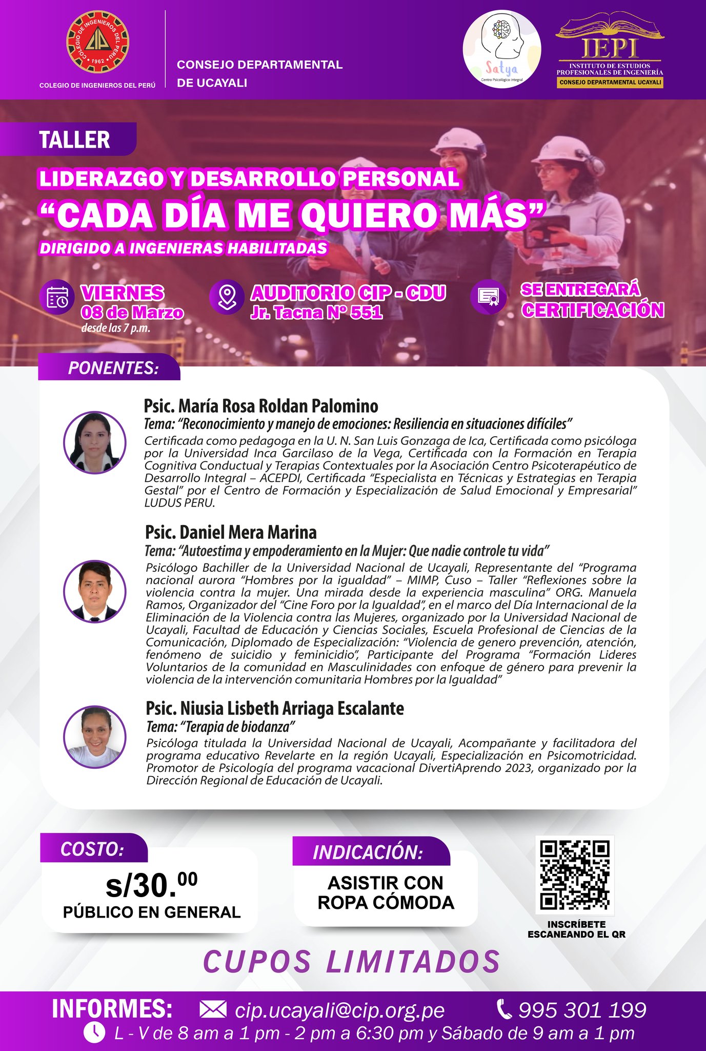𝗙𝗲𝗰𝗵𝗮: 01 Y 02 de Marzo 2024 (6:00 pm) 𝗜𝗻𝘀𝗰𝗿𝗶𝗽𝗰𝗶𝗼́𝗻: https://forms.gle/8Em6GWfQg74PYPYn9 𝗣𝗼𝗻𝗲𝗻𝘁𝗲: Mg. David Lozano Vásquez 𝗖𝗲𝗿𝘁𝗶𝗳𝗶𝗰𝗮𝗱𝗼 𝗢𝗽𝗰𝗶𝗼𝗻𝗮𝗹: S/ 30.00 𝗗𝗘𝗣𝗢́𝗦𝗜𝗧𝗢 𝗘𝗡 𝗕𝗕𝗩𝗔:CTA: 0011-0306-0100049973CCI: 011-306-000100049973-89 𝗜𝗠𝗣𝗢𝗥𝗧𝗔𝗡𝗧𝗘: 𝑒𝑛𝑣𝑖𝑎𝑟 𝑣𝑎́𝑢𝑐ℎ𝑒𝑟 𝑎 𝑙𝑎 𝑆𝑟𝑡𝑎. 𝑎𝑠𝑖𝑠𝑡𝑒𝑛𝑡𝑒 𝑑𝑒 𝐼𝐸𝑃𝐼/𝐶𝐼𝑃-𝐶𝐷𝑈 𝗜𝗡𝗙𝗢𝗥𝗠𝗘𝗦:Jhajaira Gerali Fontes Bocanegra – 995 539 111(Asis. IEPI/CIP-CDU)Link directo a WhatsApp: https://wa.me/51995539111Correo: iepi.cducayali@cip.org.pe 𝗛𝗢𝗥𝗔𝗥𝗜𝗢 𝗗𝗘 𝗔𝗧𝗘𝗡𝗖𝗜𝗢́𝗡 𝗜𝗘𝗣𝗜/𝗖𝗜𝗣-𝗖𝗗𝗨:L – V de 08:00 Hrs. a 13:00 Hrs. – 14:00 Hrs. a 17:30 Hrs.Sábado de 09:00 Hrs. a 13:00 Hrs