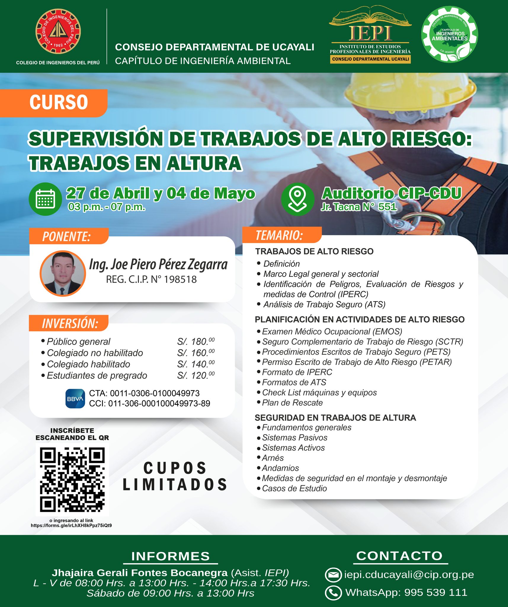 𝗙𝗲𝗰𝗵𝗮: 27 de Abril y 04 de Mayo 𝗛𝗼𝗿𝗮: 03 p.m – 07 p.m. 𝗜𝗻𝘀𝗰𝗿𝗶𝗽𝗰𝗶𝗼́𝗻: https://forms.gle/irLhXH8kPpz75iQt9 𝗣𝗼𝗻𝗲𝗻𝘁𝗲: Ing. Joe Piero Pérez Zegarra 📁 𝗕𝗥𝗢𝗖𝗛𝗨𝗥𝗘: Descargar aqui 𝗗𝗘𝗣𝗢́𝗦𝗜𝗧𝗢 𝗘𝗡 𝗕𝗕𝗩𝗔:CTA: 0011-0306-0100049973CCI: 011-306-000100049973-89 𝗜𝗠𝗣𝗢𝗥𝗧𝗔𝗡𝗧𝗘: 𝑒𝑛𝑣𝑖𝑎𝑟 𝑣𝑎́𝑢𝑐ℎ𝑒𝑟 𝗜𝗡𝗙𝗢𝗥𝗠𝗘𝗦:NRO CIP-CDU: 995 301 199Link directo a WhatsApp: https://wa.me/51995301199 𝗛𝗢𝗥𝗔𝗥𝗜𝗢 𝗗𝗘 𝗔𝗧𝗘𝗡𝗖𝗜𝗢́𝗡 𝗖𝗜𝗣-𝗖𝗗𝗨:L – V de 08:00 Hrs. a 13:00 Hrs. – 14:00 Hrs.a 18:30 Hrs.Sábado de 09:00 Hrs. a 13:00 Hrs