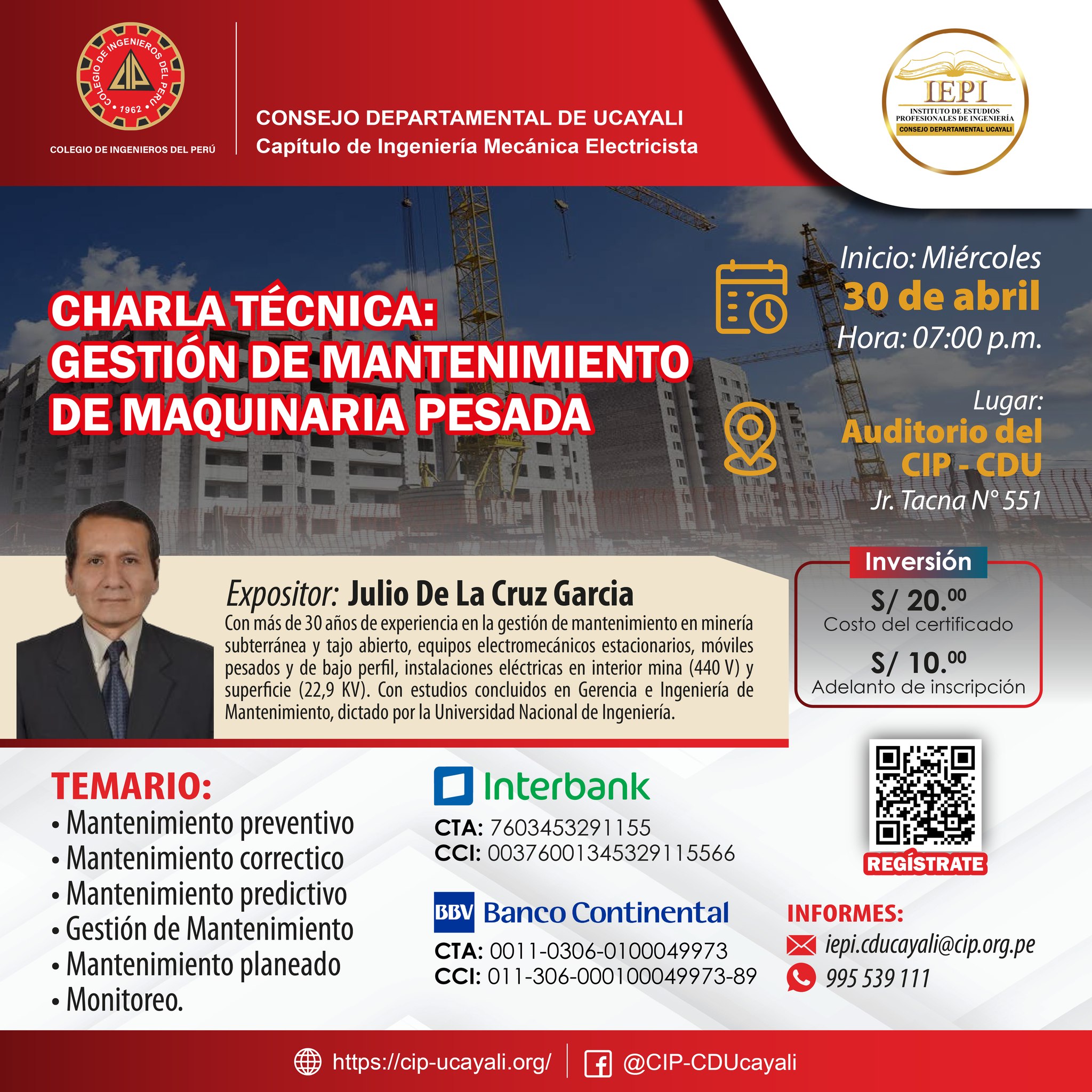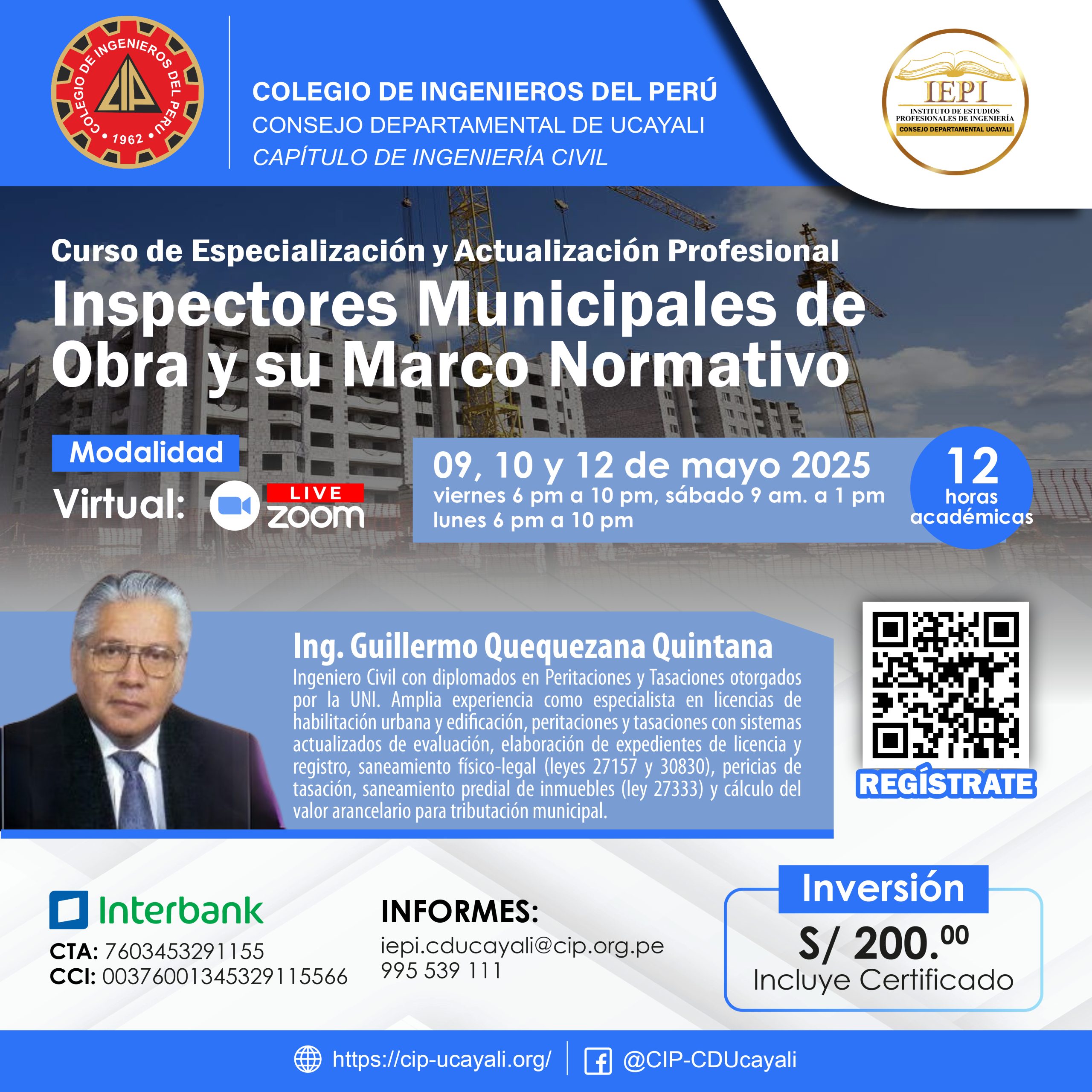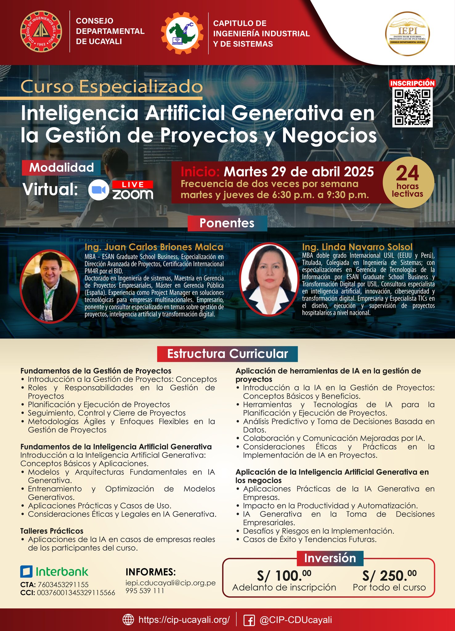 ๐๐ฒ๐ฐ๐ต๐ฎ: 09, 10 y 12 de mayo 2025 ๐ ๐ผ๐ฑ๐ฎ๐น๐ถ๐ฑ๐ฎ๐ฑ: Virtual (Zoom) ๐๐ผ๐ฟ๐ฎ: viernes 6 pm a 10 pm, sรกbado 9 am. a 1 pm y lunes 6 pm a 10 pm ๐๐ป๐๐ฐ๐ฟ๐ถ๐ฝ๐ฐ๐ถ๐ผฬ๐ป: https://forms.gle/bKZkur1PpEtKgLW36 ๐๐ป๐๐ฒ๐ฟ๐๐ถ๐ผฬ๐ป: (๐ถ๐ป๐ฐ๐น๐๐๐ฒ ๐ฐ๐ฒ๐ฟ๐๐ถ๐ณ๐ถ๐ฐ๐ฎ๐ฑ๐ผ) S/. 200.00 IMPORTANTE: enviar vรกucher a IEPI/CIP-CDU ๐๐๐ฃ๐ขฬ๐ฆ๐๐ง๐ข ๐๐ก ๐๐ก๐ง๐๐ฅ๐๐๐ก๐:CTA: : 7603453291155CCI: 00376001345329115566 ๐๐๐ฃ๐ขฬ๐ฆ๐๐ง๐ข ๐๐ก ๐๐๐ฉ๐:CTA: 0011-0306-0100049973CCI: 011-306-000100049973-89 ๐๐ก๐๐ข๐ฅ๐ ๐๐ฆ: 995 539 111Link directo a WhatsApp: https://wa.me/51995539111Correo: iepi.cducayali@cip.org.pe ๐๐ข๐ฅ๐๐ฅ๐๐ข ๐๐ ๐๐ง๐๐ก๐๐๐ขฬ๐ก ๐๐๐ฃ๐/๐๐๐ฃ-๐๐๐จ:Lunes a Viernes: 09:00 – 13:00 | 14:00 – 18:30Sรกbados: 09:00 – 13:00