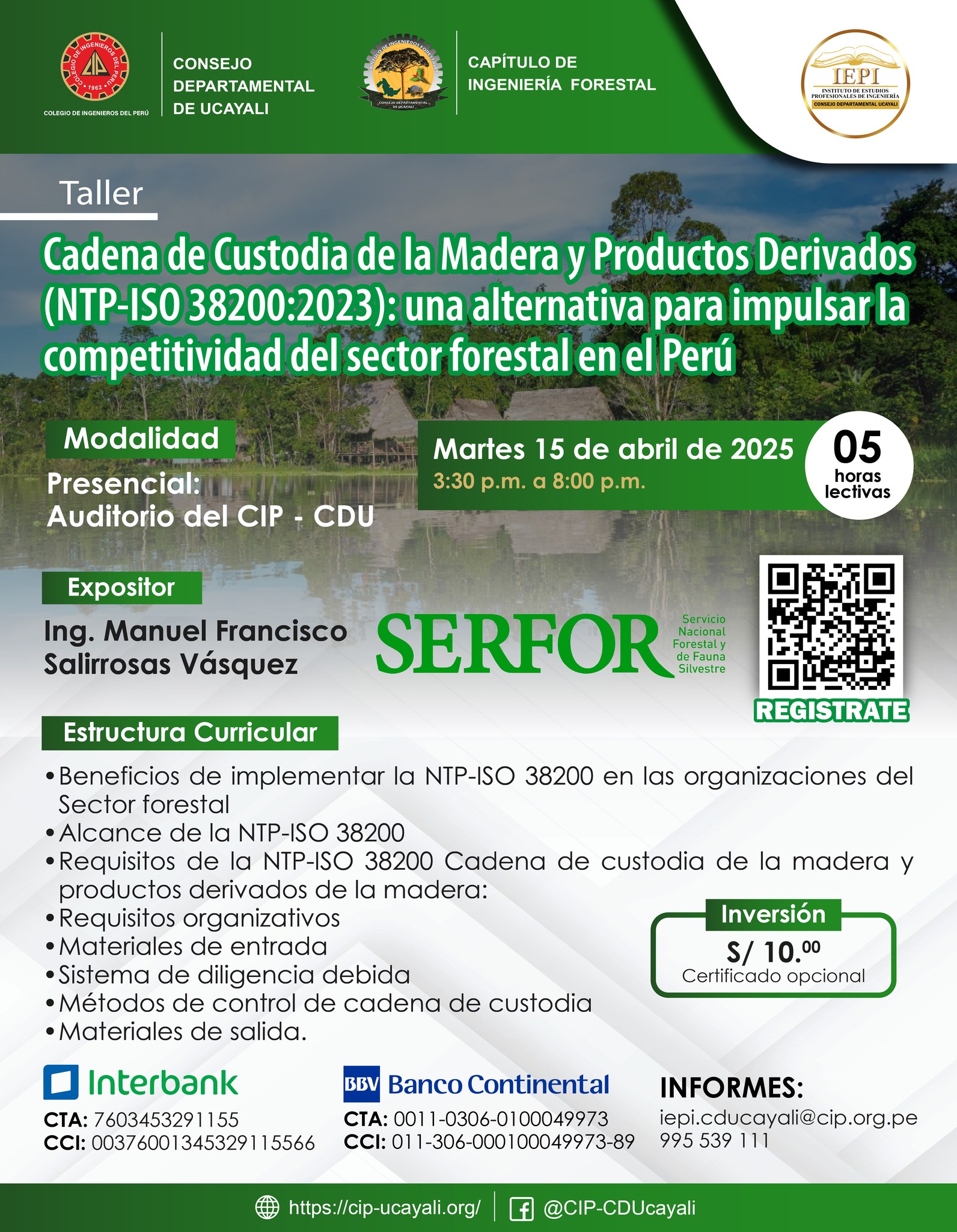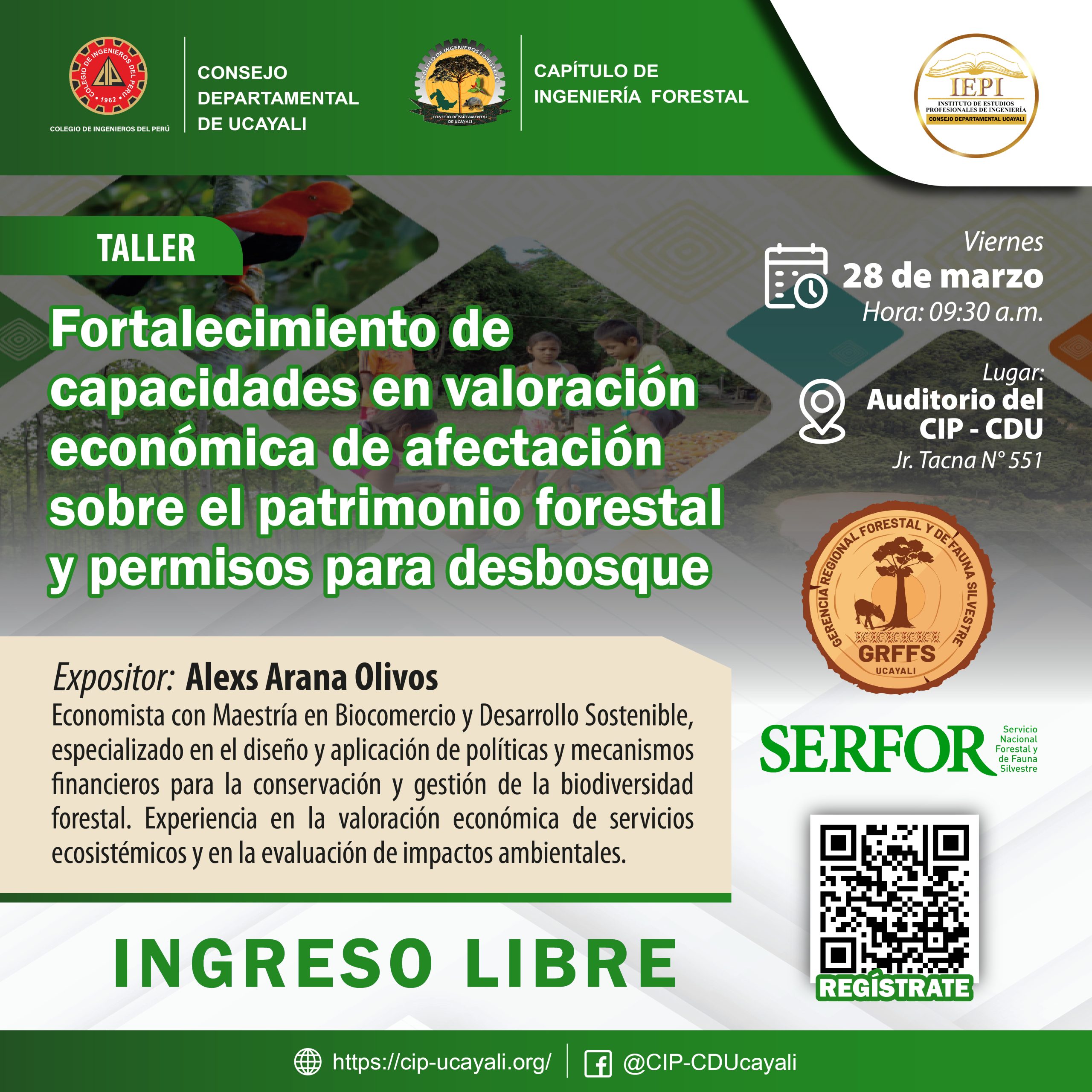 ยกAtenciรณn, profesionales y estudiantes del sector forestal! Te invitamos al ๐ง๐ฎ๐น๐น๐ฒ๐ฟ: ๐๐ผ๐ฟ๐๐ฎ๐น๐ฒ๐ฐ๐ถ๐บ๐ถ๐ฒ๐ป๐๐ผ ๐ฑ๐ฒ ๐ฐ๐ฎ๐ฝ๐ฎ๐ฐ๐ถ๐ฑ๐ฎ๐ฑ๐ฒ๐ ๐ฒ๐ป ๐๐ฎ๐น๐ผ๐ฟ๐ฎ๐ฐ๐ถ๐ผฬ๐ป ๐ฒ๐ฐ๐ผ๐ป๐ผฬ๐บ๐ถ๐ฐ๐ฎ ๐ฑ๐ฒ ๐ฎ๐ณ๐ฒ๐ฐ๐๐ฎ๐ฐ๐ถ๐ผฬ๐ป ๐๐ผ๐ฏ๐ฟ๐ฒ ๐ฒ๐น ๐ฝ๐ฎ๐๐ฟ๐ถ๐บ๐ผ๐ป๐ถ๐ผ ๐ณ๐ผ๐ฟ๐ฒ๐๐๐ฎ๐น ๐ ๐ฝ๐ฒ๐ฟ๐บ๐ถ๐๐ผ๐ ๐ฝ๐ฎ๐ฟ๐ฎ ๐ฑ๐ฒ๐๐ฏ๐ผ๐๐พ๐๐ฒ ๐๐ฒ๐ฐ๐ต๐ฎ: 28 de marzo 2025 ๐ ๐ผ๐ฑ๐ฎ๐น๐ถ๐ฑ๐ฎ๐ฑ: Presencial (Auditorio CIP-CDU) ๐๐ผ๐ฟ๐ฎ: 9:30 a.m. ๐๐ป๐๐ฐ๐ฟ๐ถ๐ฝ๐ฐ๐ถ๐ผฬ๐ป: https://forms.gle/RPWUGZk6dC9aa4f29 ยกIngreso Libre! No pierdas esta oportunidad de fortalecer tus conocimientos y ampliar tu red de contactos.