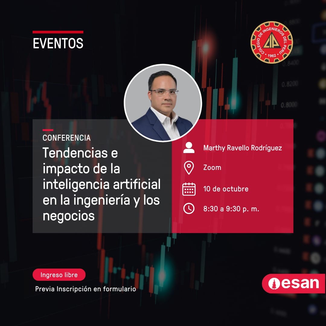 ¡No te pierdas la conferencia de ESAN! Tendencias e Impacto de la Inteligencia Artificial en la Ingeniería y los negocios 10 de octubre – Calendario 08:30 p.m. Inscríbete: https://www.esan.edu.pe/…/tendencias-e-impacto-de-la… Ponente: Marthy Ravello Rodríguez