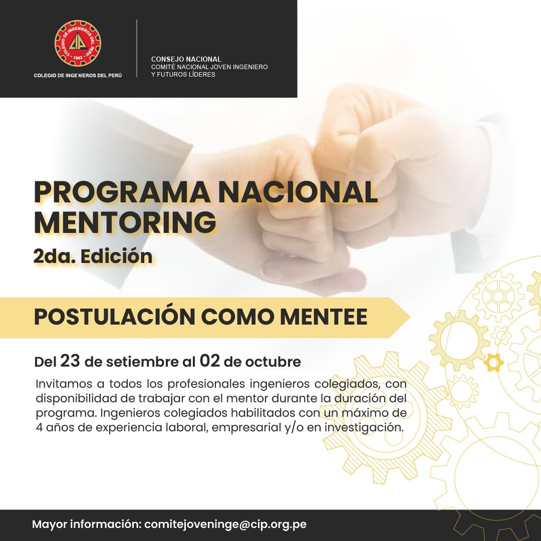¡Postula como Mentee en el CIP! Si eres un ingeniero colegiado con hasta 4 años de experiencia y quieres recibir orientación de un mentor experto, esta es tu oportunidad para crecer profesionalmente. 💼🌟 El programa está dirigido a ingenieros colegiados habilitados, con disponibilidad para trabajar de la mano con un mentor durante toda la duración del programa. 📅 Fecha de postulación: Del 23 de septiembre al 2 de octubre📋 Inscripción: Completa el formulario y adjunta los documentos solicitados aquí: https://acortar.link/M5DnJQ📌 Bases y requisitos: https://acortar.link/YRvrJ5 ¡No dejes pasar esta oportunidad de ser parte del crecimiento de la comunidad ingenieril! 🚀