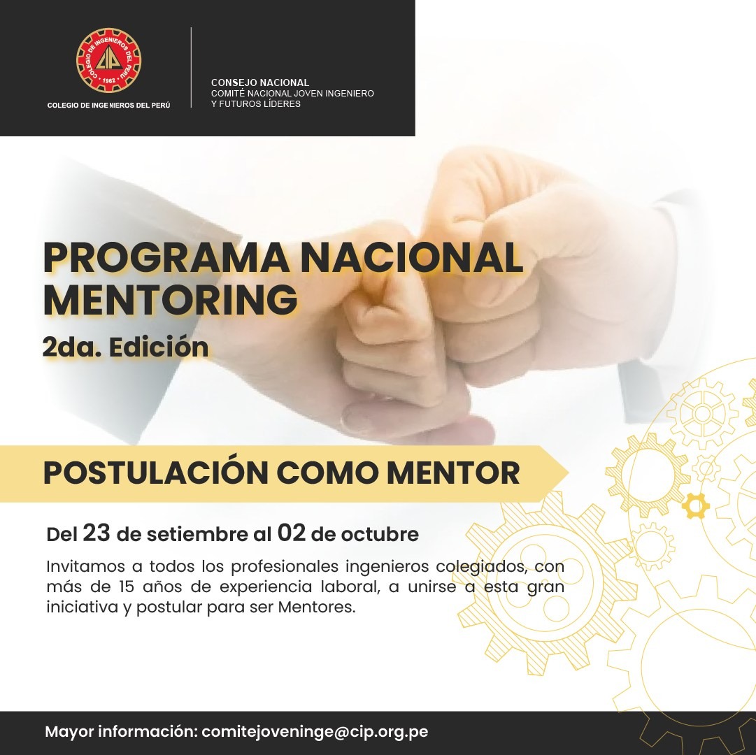 ¡Postula como Mentor en el CIP! ¿Eres Ingeniero Colegiado y deseas compartir tu experiencia? ¡Esta es tu oportunidad! 🙌 Participa en nuestra Convocatoria de Mentores y contribuye al desarrollo profesional de nuevos talentos en ingeniería. 📅 Fecha de postulación: Del 23 de septiembre al 2 de octubre.📋 Inscripción: Completa el formulario y adjunta los documentos solicitados aquí: https://acortar.link/IdnPJb📌 Bases y requisitos: https://acortar.link/MpLbv8 ¡No dejes pasar esta oportunidad de ser parte del crecimiento de la comunidad ingenieril! 🚀