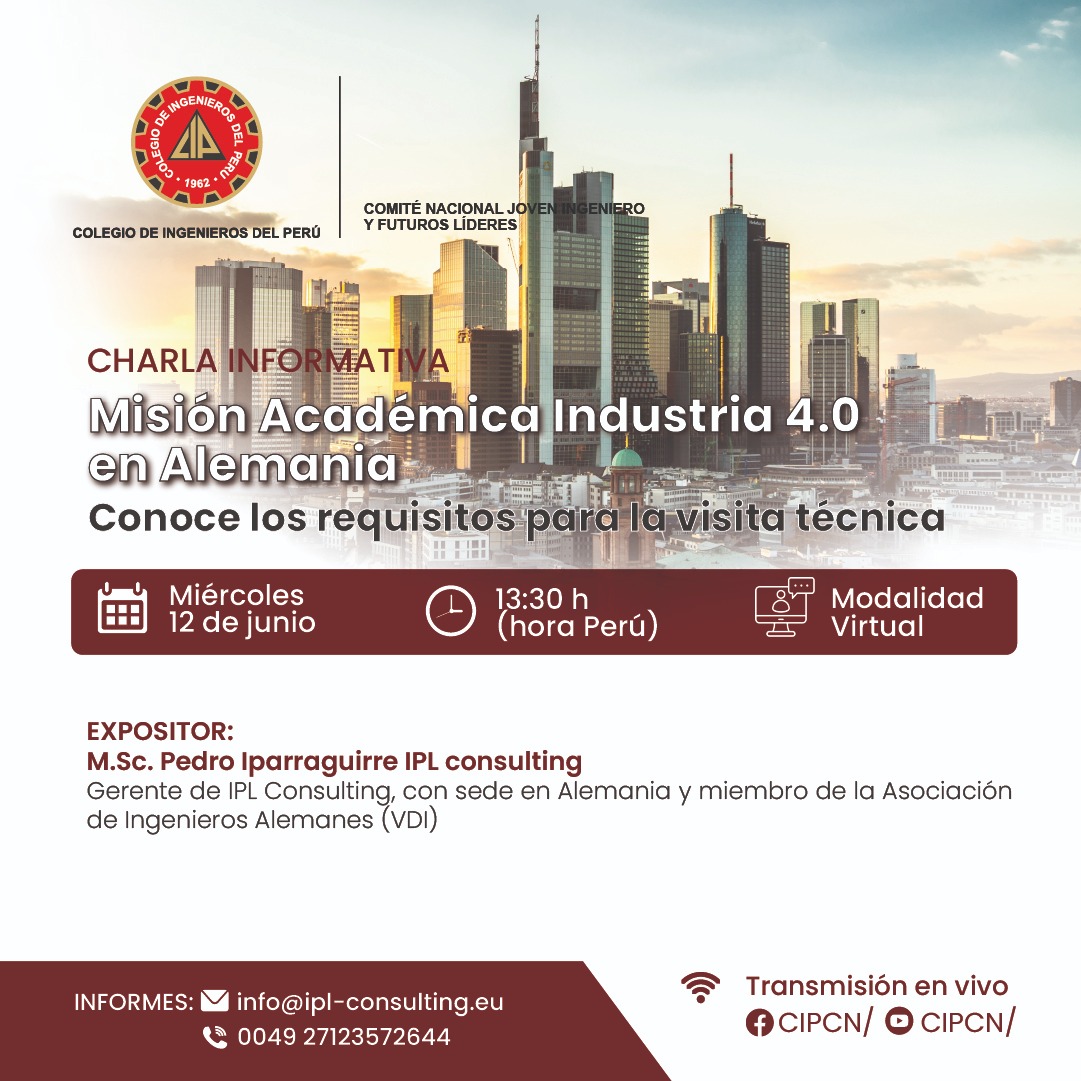 Conoce los requisitos para la visita técnica en esta sesión especial. Miércoles 12 de junio 13:30 h (hora Perú) Modalidad Virtual Expositor:M.Sc. Pedro Irarraguirre, Gerente de IPL Consulting, con sede en Alemania y miembro de la Asociación de Ingenieros Alemanes (VDI). Contacto: info@ipl-consulting.eu 0049 27123572644 Sigue la transmisión en vivo:Canal de Youtube: https://youtube.com/@CIPCNPágina de Facebook: https://www.facebook.com/cipcn?mibextid=ZbWKwL #Industria40#Alemania#CIPCN#CharlaInformativa#Ingeniería#VisitaTécnica