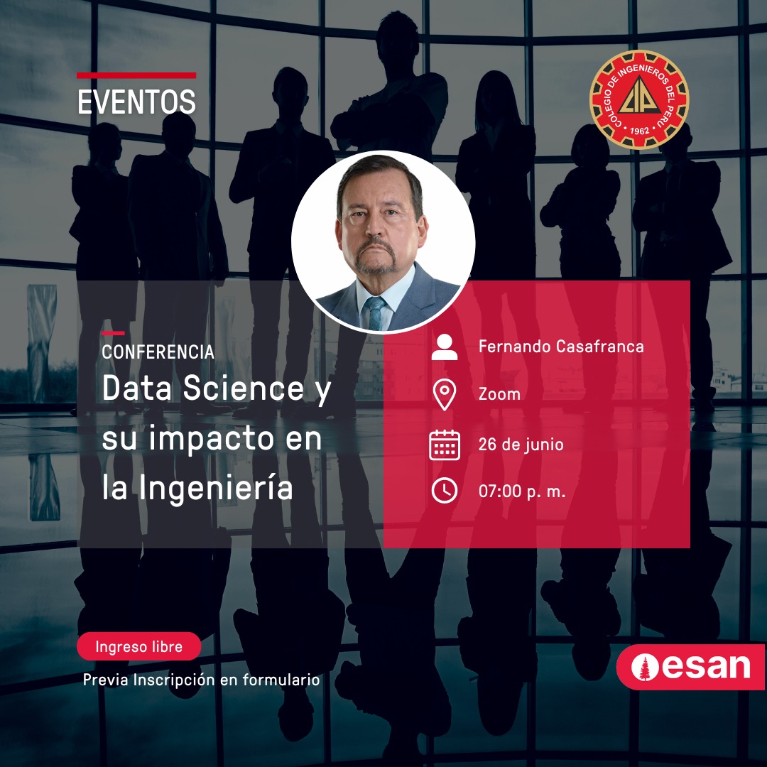 ¡No te pierdas la conferencia de ESAN! Data Science y su impacto en la Ingeniería 26 de junio 07:00 p.m. Inscríbete: https://www.esan.edu.pe/…/data-science-y-su-impacto-en… Ponente: Fernando Casafranca Ingreso libre previa inscripción. ¡Regístrate ya! ¡Lo esperamos!