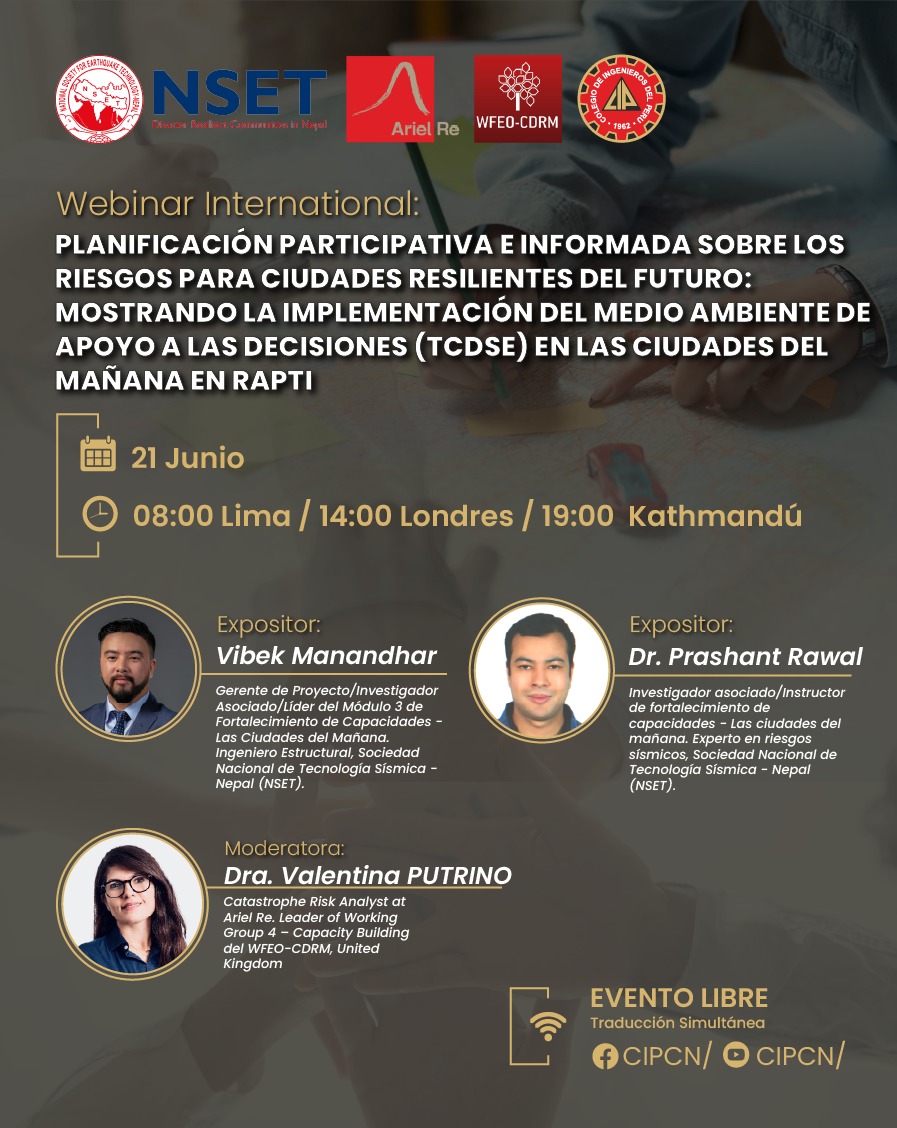 𝐄𝐕𝐄𝐍𝐓𝐎𝐒 𝐂𝐃𝐑𝐌 𝐖𝐅𝐄𝐎 – 𝐂𝐈𝐏 Webinar Internacional: PLANIFICACIÓN PARTICIPATIVA E INFORMADA SOBRE LOS RIESGOS PARA CIUDADES RESILIENTES DEL FUTURO: MOSTRANDO LA IMPLEMENTACIÓN DEL MEDIO AMBIENTE DE APOYO A LAS DECISIONES (TCDSE) EN LAS CIUDADES DEL MAÑANA EN RAPTI Fecha: 21 de Junio Hora: 08:00hrs (Lima-Perú) Hora: 14:00hrs (Londres) Hora: 19:00hrs (Katmandú) Expositor: Vibek Manandhar Dr. Prashant Rawal Expositor: Dra. Valentina Putrino Canal de Youtube: https://youtube.com/@CIPCNPágina de Facebook: https://www.facebook.com/cipcn?mibextid=ZbWKwL Informes: wfeo@cip.org.pe¡No te lo pierdas !