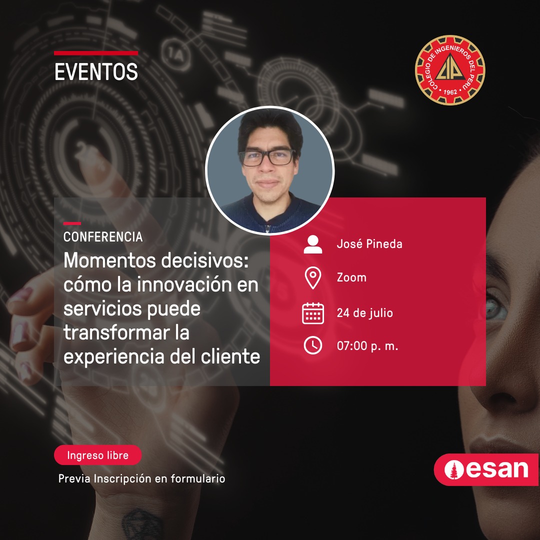 ¡No te pierdas esta conferencia! Únete a nosotros el próximo 24 de julio a las 7:00 p.m. para descubrir cómo la innovación en servicios puede transformar la experiencia del cliente. Ponente: José Pineda Plataforma: Zoom Fecha: 24 de julio Hora: 7:00 p.m. Ingreso libre previa inscripción en el formulario: https://www.esan.edu.pe/…/momentos-decisivos-como-la… ¡Te esperamos!